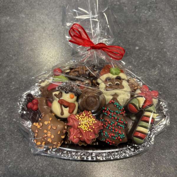 Grote bamboeschaal gevuld met kerstchocolade, gevuld en ongevuld